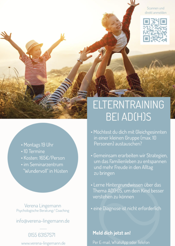 ADHS betrifft nicht nur das Kind, sondern die ganze Familie. Mit dem richtigen Wissen und den passenden Strategien kannst du den Familienalltag erleichtern und die Beziehung zu deinem Kind stärken. Du entwickelst mehr Verständnis für das Verhalten deines Kindes, lernst es liebevoll zu begleiten und ihm den Rücken stärken. Mein Elterntraining bietet dir eine wertvolle Unterstützung auf diesem Weg.